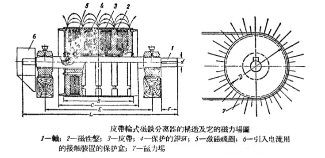 在皮帶輪式分離器內(nèi),沿著輪子的轉動其表面會產(chǎn)生強大的磁場,在較小直徑處的磁場達到750-900奧斯特,較大直徑處磁場達到1200-1400奧斯特,當即將進行球磨機粉碎的物料內(nèi)金屬塊落到這個磁場時,就會被吸進并貼在筒上,然后脫落而被皮帶擲落到分離器下方的特殊卸斗內(nèi)。其具體結構如圖: